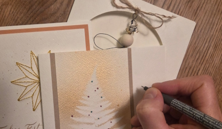 Emilie Studer gestaltete am 18. November 2025 einen kreativen Abend, an dem verschiedene Weihnachtskarten gefertigt werden konnten. Es wurde gesprüht, gestickt, Draht geformt und kalligraphiert - und so entstanden wunderschöne, von Hand gestaltete Karten, die nicht nur den Kursteilnehmerinnen Freude bereiten, sondern sicher auch all' jenen, die sie empfangen dürfen.